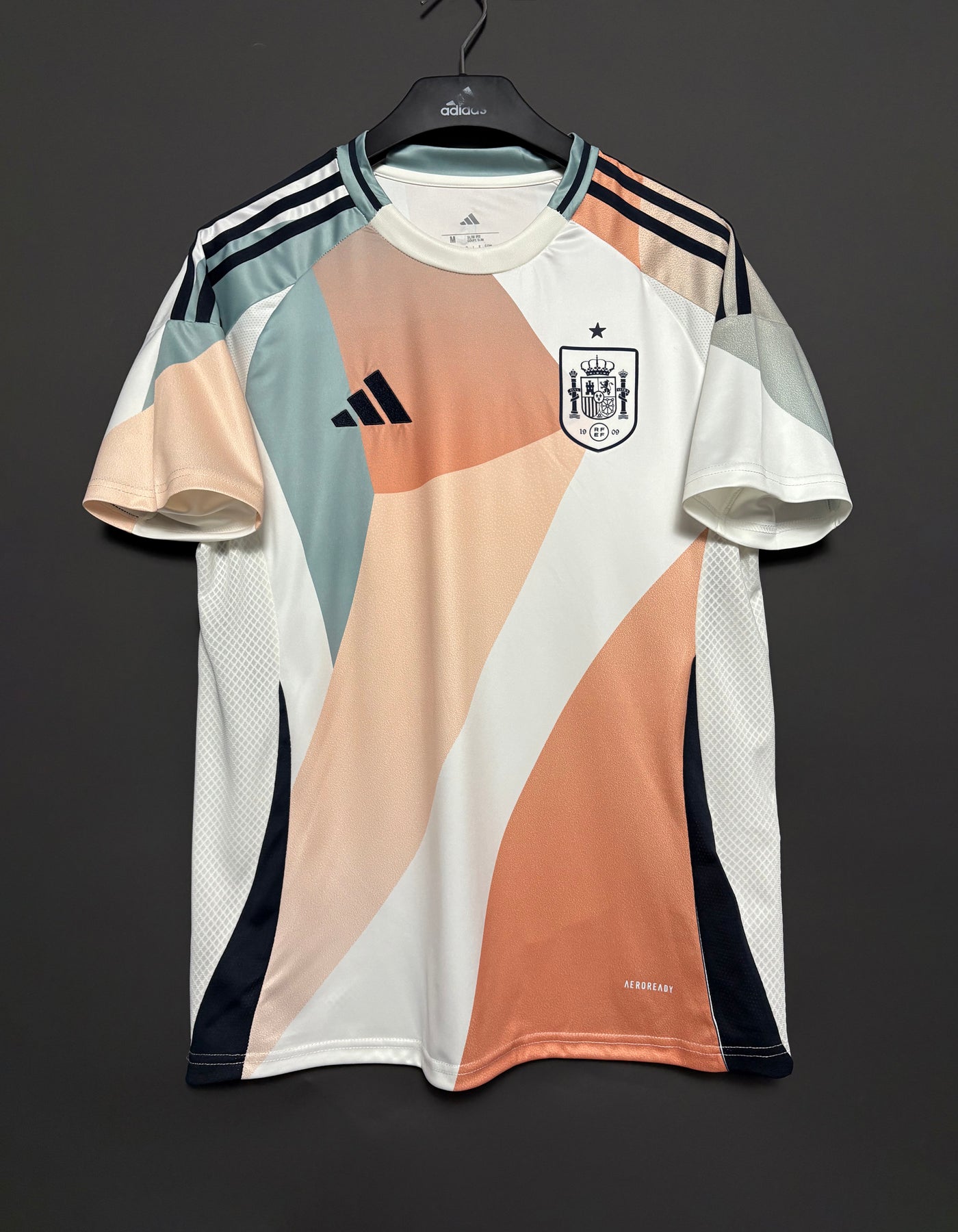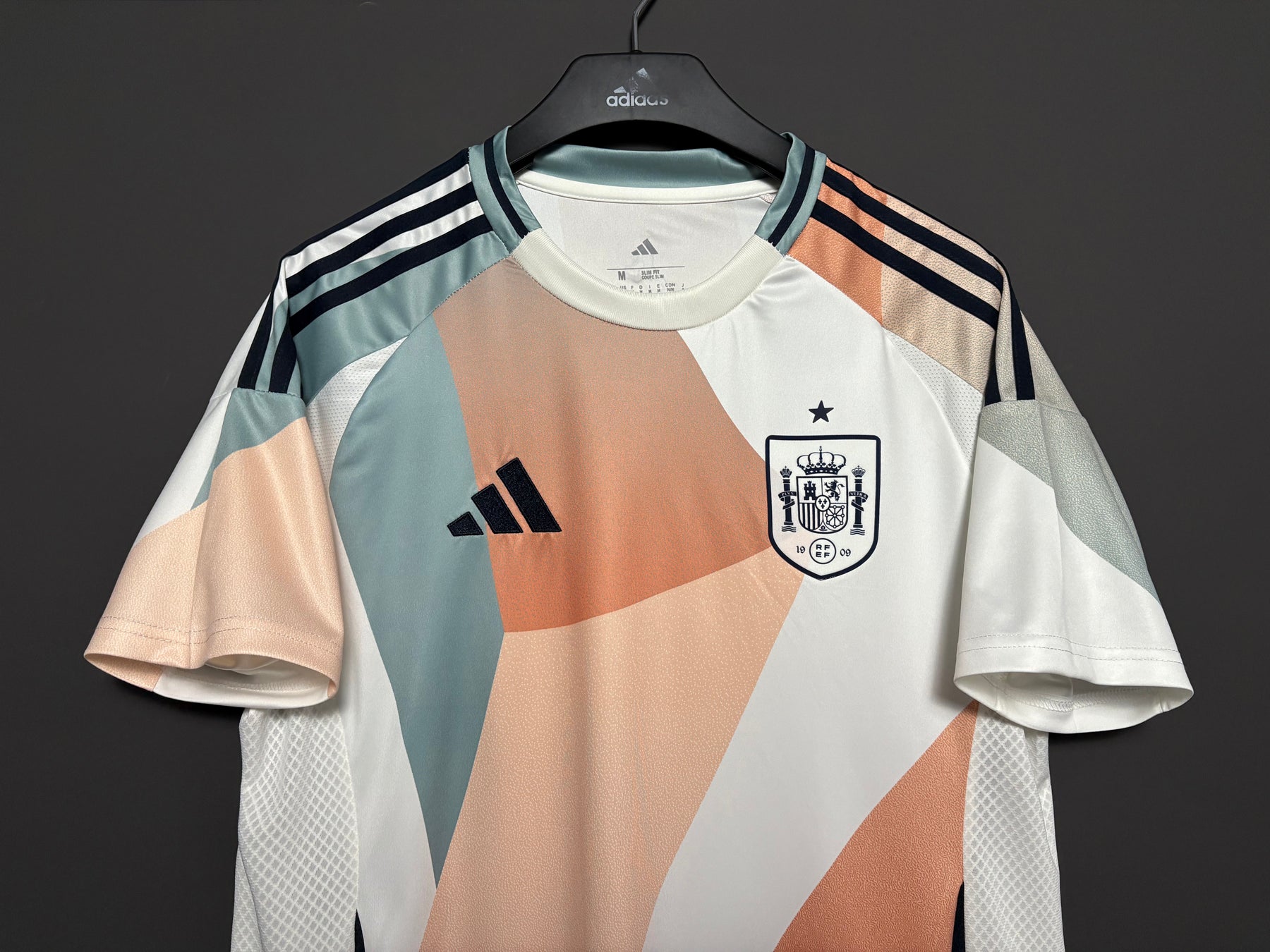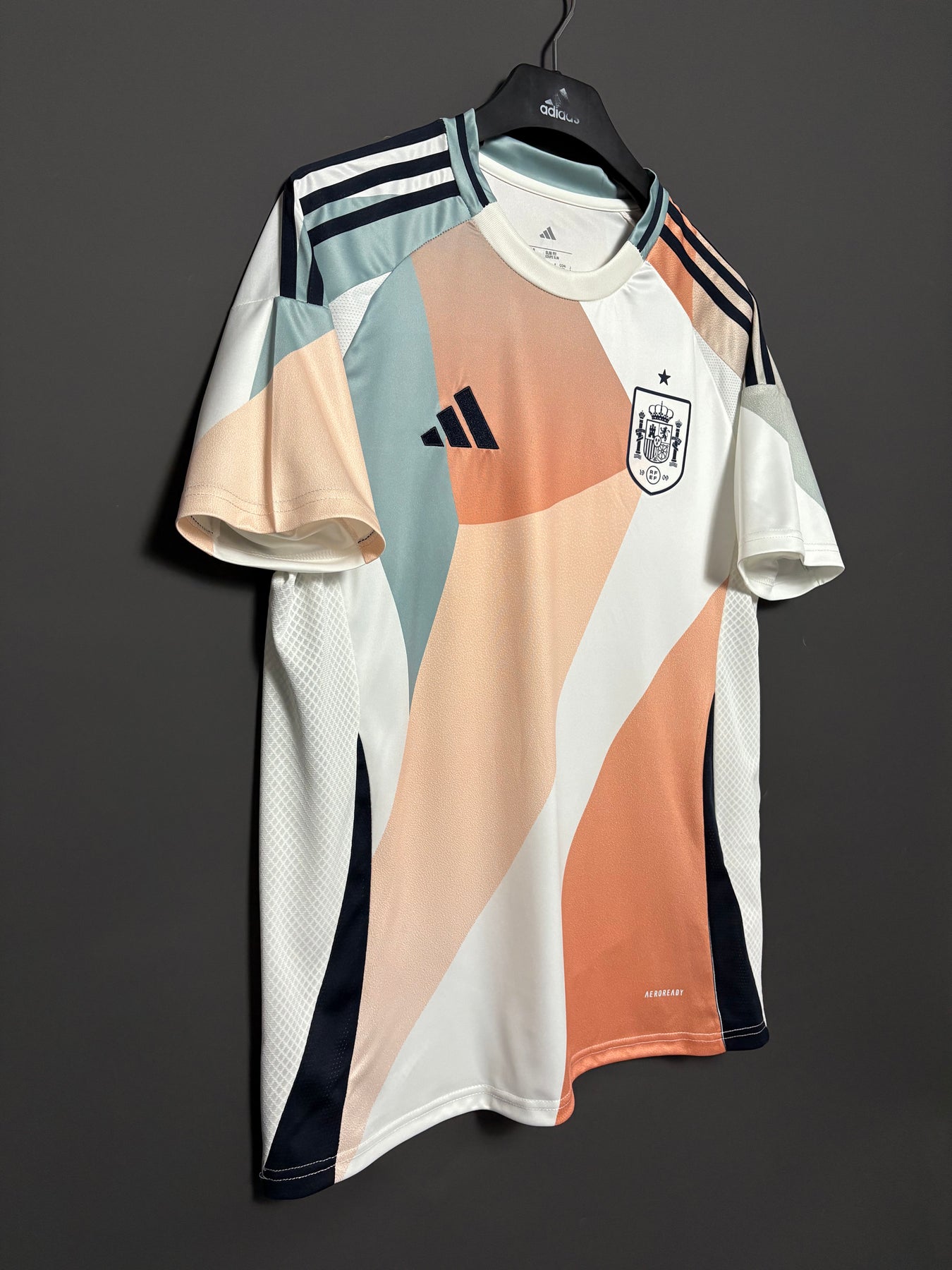Spaniens damlandslagströja har en modern design med mjuka färgövergångar i vitt, beige och pastelltoner. Det stilrena mönstret ger tröjan ett unikt och elegant uttryck, medan det lätta och andningsbara materialet säkerställer hög komfort både på planen och till vardags. Perfekt för supportrar som vill visa sitt stöd med stil.