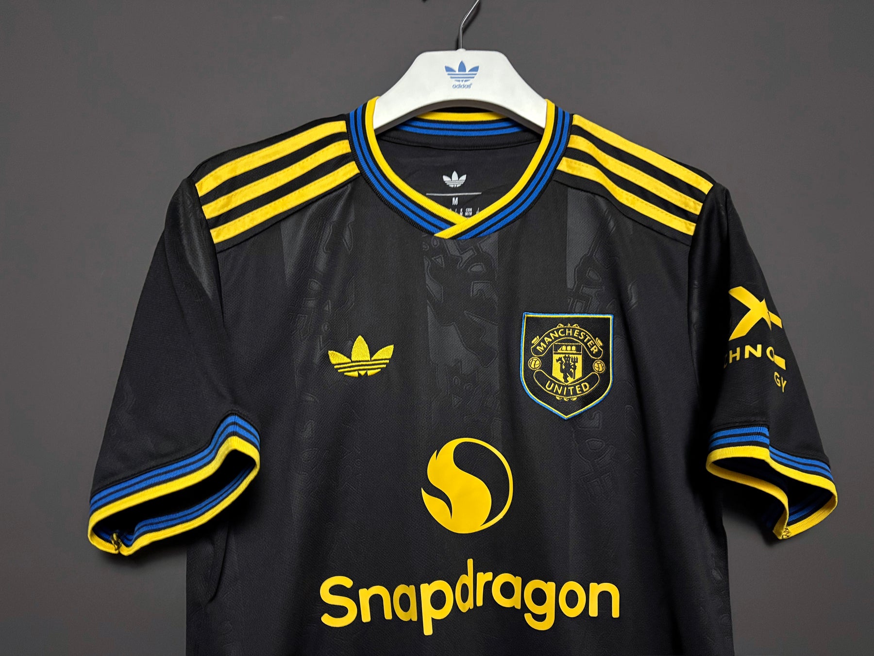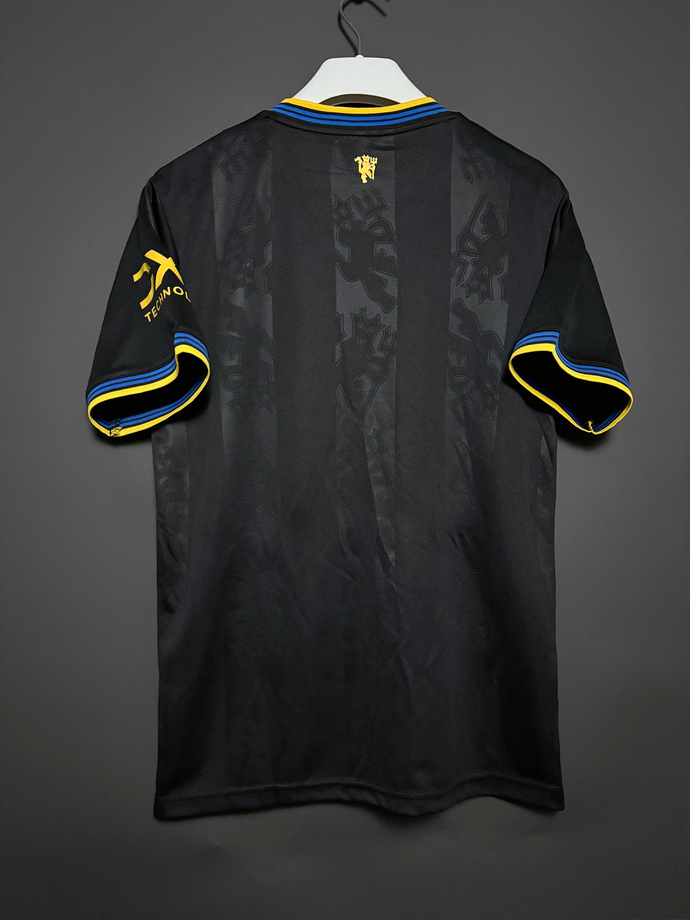 Manchester Uniteds tredjetröja har en stilren svart design med subtila ton-i-ton-mönster som ger ett modernt och exklusivt uttryck. De gula detaljerna och ränderna på axlarna skapar en stark kontrast och ger tröjan en energisk och sportig look. Klubbmärket och sponsorloggan i gult förstärker den distinkta stilen. Tröjan är tillverkad i lätt och andningsbart material som ger hög komfort både under match och till vardags.