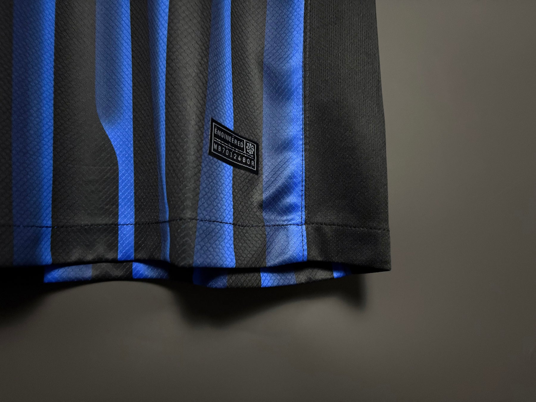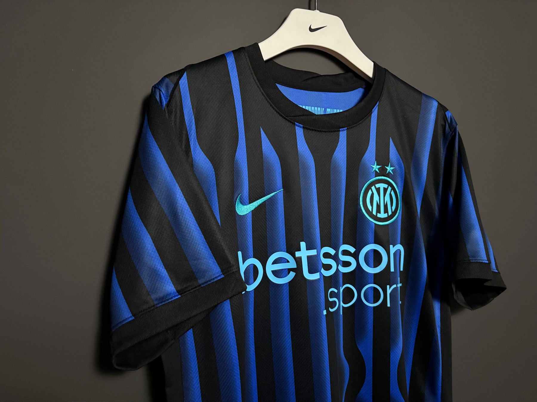 Inters hemmatröja har en modern design med klassiska svarta och blå ränder i ett dynamiskt mönster. De ljusblå detaljerna i logotyper och sponsor skapar en fräsch kontrast mot den mörka basen. Tröjan är tillverkad i lätt och andningsbart material som ger hög komfort både under match och till vardags.